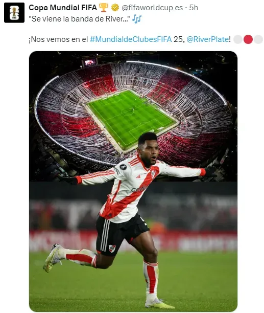 Por otro lado, entre otros posteos que hizo tanto en inglés como en español, la FIFA subió: una imagen del escudo de River y otras dos de la hinchada, retuiteó la cuenta del club y citó con un ”nos vemos en Estados Unidos”, y dedicó una postal al Monumental con una celebración de Borja a la cual título con ”se viene la banda de River…”, siendo esta última la que más interacción generó.