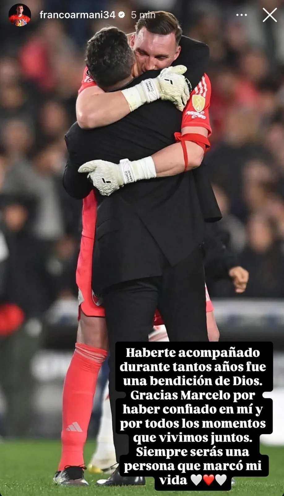 - Franco Armani subió un posteo a Instagram junto a Marcelo Gallardo para despedirlo tras su salida de River.