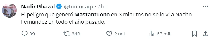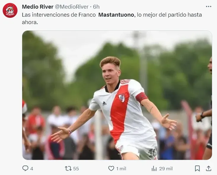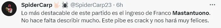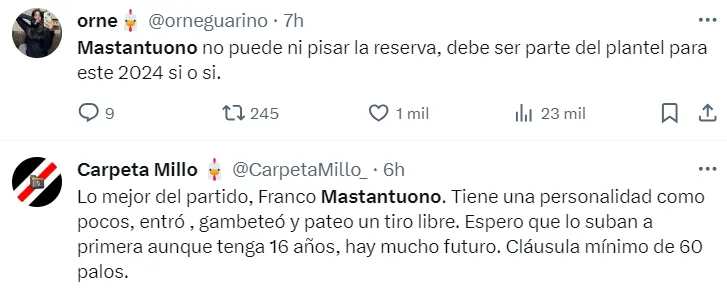 Es habitual que en las redes sociales se vaya comentando lo que va sucediendo en el partido. Los hinchas de River fueron compartiendo sus sensaciones y, en líneas generales, se hablaba de lo aburrido que era el partido. Pero cuando entró Franco Mastantuono los comentarios fueron cambiando y fueron muchos lo que llenaron de elogios al pibe de 16 años que tiene mucho para dar.