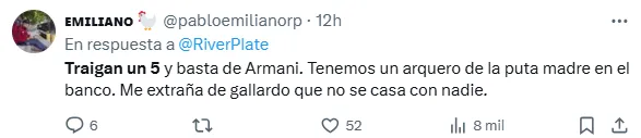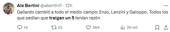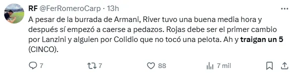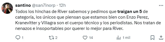 Una vez finalizado el encuentro, las tendencias de esa misma red social marcaban la frase “TRAIGAN UN 5” en lo más alto. Para los simpatizantes, el Millonario debe ir a buscar otro volante central para que se haga dueño del mediocampo, pensando en los grandes objetivos del equipo para el 2025.