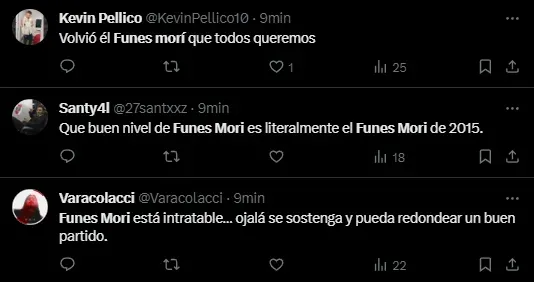 Claro, con una formación tan ofensiva como la planteada por Demichelis, los defensores deben estar firmes y sólidos en su rol para no sufrir sobresaltos de contragolpe, ya que la chance de quedar mal parados en la zona defensiva puede ser una cuestión frecuente. Por eso, la performance del “Mellizo” Funes Mori tuvo gran reconocimiento en las redes sociales entre los hinchas de River.