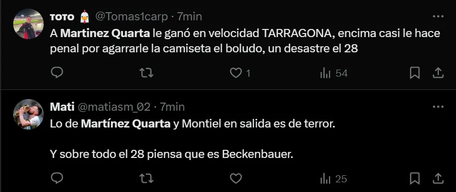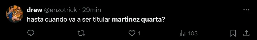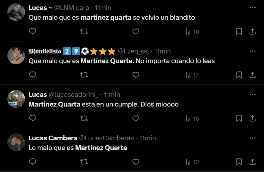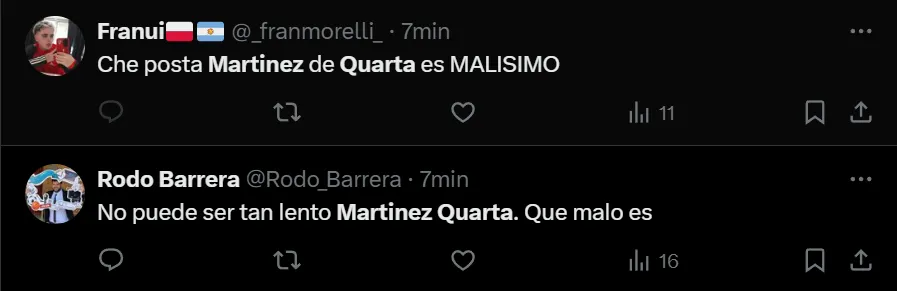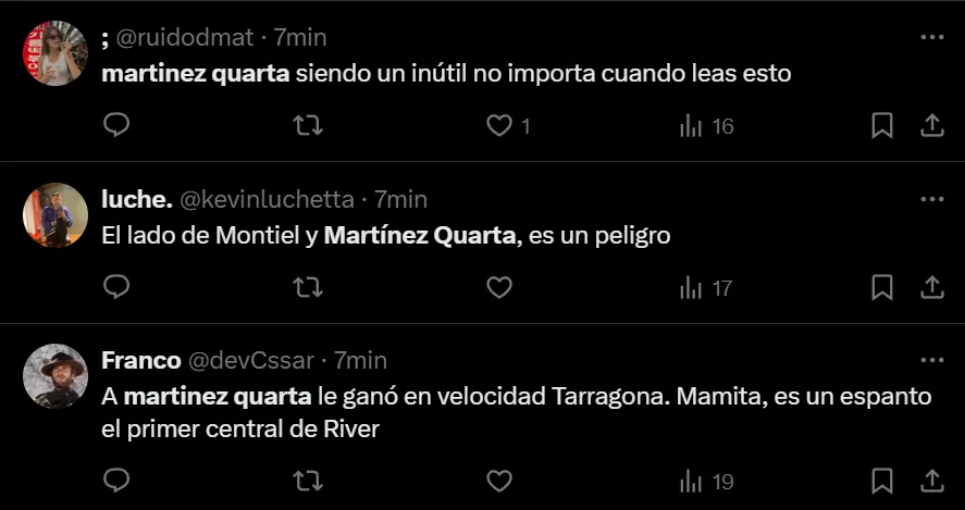 “¿Hasta cuándo va a ser titular Martínez Quarta?”, se preguntó el usuario @enzotrick, aunque no fue el único hincha de River que criticó la titularidad del ex zaguero de Fiorentina y la Selección Argentina. Incluso, hubo quienes cuestionaron sus cualidades a la hora de ser salida o para realizar un relevo defensivo.
