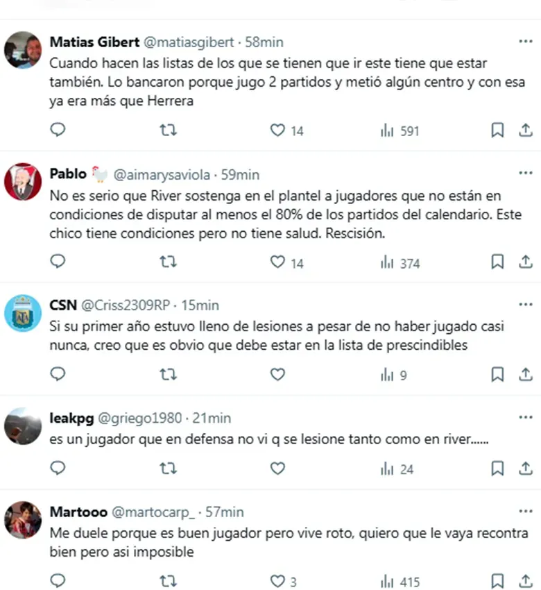 “Cuando hacen las listas de los que se tienen que ir este tiene que estar también. Lo bancaron porque jugo 2 partidos y metió algún centro y con eso ya era más que Herrera”, advirtió otro en la misma línea. “Me duele porque es buen jugador pero vive roto, quiero que le vaya recontra bien, pero así imposible”, expresó un tercero. “¿Quién aprueba las revisiones médicas?”, se preguntó uno más. “Este tipo no puede seguir en River en 2025”, sentenció otro.