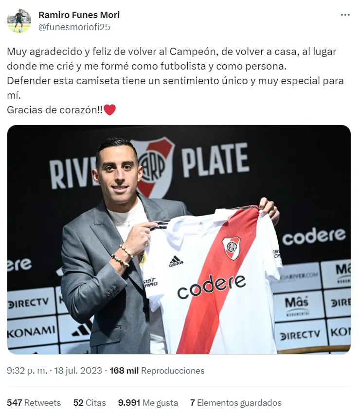 En otro párrafo dentro del mismo posteo, agregó: “Defender esta camiseta tiene un sentimiento único y muy especial para mí”. Y cerró: “Gracias de corazón”. Tras casi 8 años, Funes Mori volverá a ponerse la camiseta de River para pelear un puesto en la zaga central.