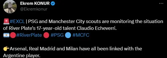 Según se conoció en las últimas horas en la información de Ekrem Konur, el Diablito Echeverri sería observado de cerca por ojeadores no solo del conjunto inglés sino también del PSG de Francia. Un interés que ya habían demostrado en el pasado.