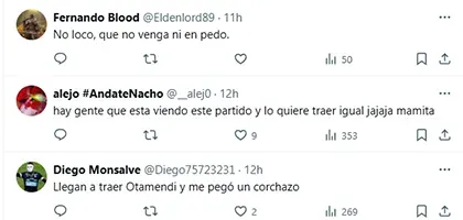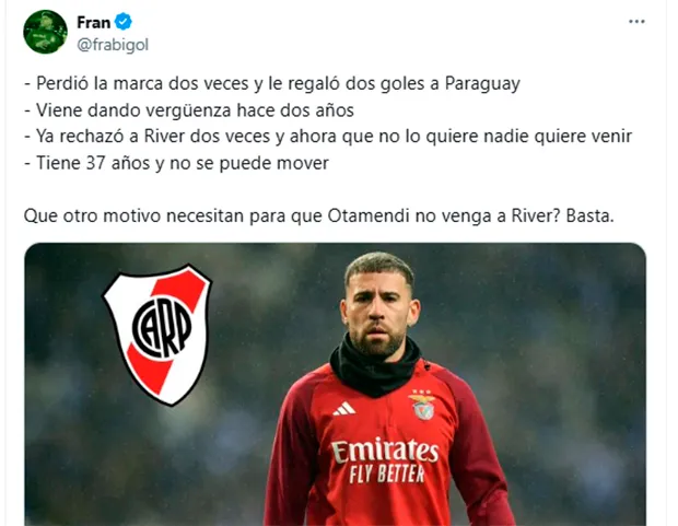 Ese rendimiento del defensor de 36 años que, se avanzó, no continuaría en Benfica hizo que varios hinchas del Millonario se pusieran en alerta y pidieran que no se haga ningún esfuerzo por sacarlo de Portugal. “Bocón, mala leche, viejo, se mueve como babosa, nos rechazó tres veces, no puede contra jugadores paraguayos, hace un año que no juega bien y ahora que no lo quiere nadie quiere venir. Hoy quedó clarito que Otamendi tiene que estar lejos de River. No traigan a Otamendi”, escribió Fran, un usuario muy popular entre los riverplatenses en X.