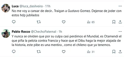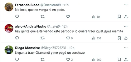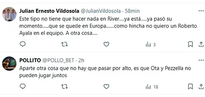 Esa expresión abrió las puertas a muchas otras similares. “Este tipo no tiene nada que hacer en River. Ya está, ya pasó su momento. Que se quede en Europa. Como hincha de River no quiero un Roberto Ayala. A otra cosa”, expresó uno. “Que Otamendi se quede en Europa, por favor”, pidió otro. “No es el jugador que necesita River y lo dicen todos los hinchas. No lo traigan”, señaló uno más. “Déjense de joder con jubilados. Traigan a Gustavo Gómez”, propuso otro en referencia al defensor de la Selección de Paraguay”.