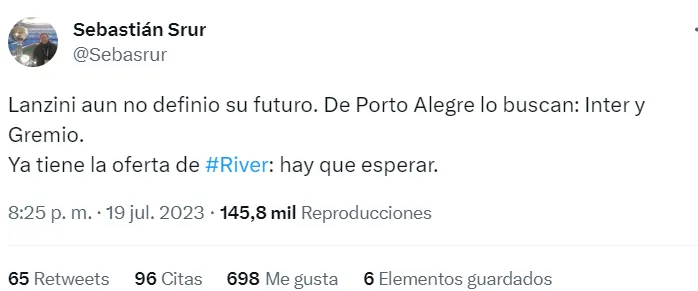 Además, el periodista agregó que el futbolista ya tiene sobre la mesa la oferta del club de Núñez, pero aún no tomó ninguna decisión. River, mientras tanto, apunta todos los cañones a cerrar a Facundo Colidio y Sebastián Boselli en los próximos días.