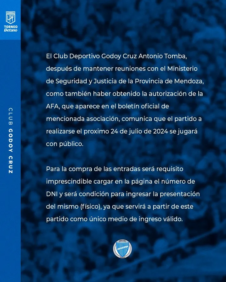 “El Club Deportivo Godoy Cruz Antonio Tomba, después de mantener reuniones con el Ministerio de Seguridad y Justicia de la provincia de Mendoza, como también haber obtenido la autorización de la AFA, que aparece en el boletín oficial de mencionada asociación, comunica que el partido a realizarse el próximo 24 de julio se jugará con público”.