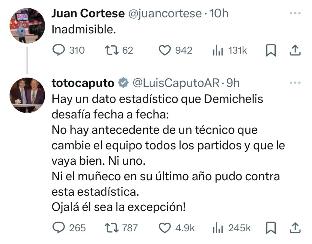 Su aparición se dio respondiéndole un tuit al periodista Juan Cortese. “Hay un dato estadístico que Demichelis desafía fecha a fecha: No hay antecedente de un técnico que cambie el equipo todos los partidos y que le vaya bien. Ni uno“, aseguró.