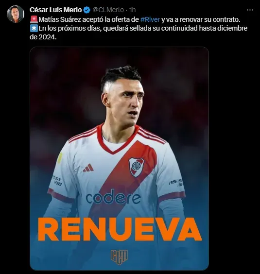 El periodista César Merlo reveló que la extensión contractual de Matías Suárez con River está confirmada, por lo que el cordobés seguirá una temporada más en la institución riverplatense.