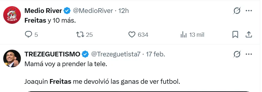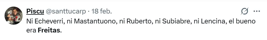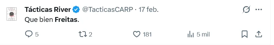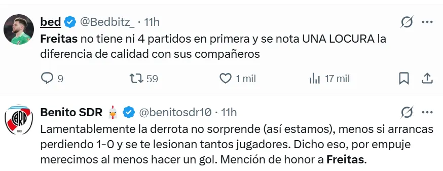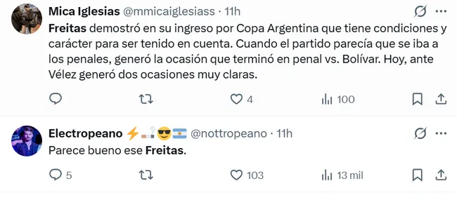 “Mención de honor a Freitas”, “Freitas me encanta”, “Freitas en 4 días expuso a todos los delanteros del plantel”, “En un momento pesadísimo destaca”, “Freitas y 10 más”, “Freitas tiene que ser titular”, “Freitas es un fenómeno”, fueron algunos de los comentarios destacando al delantero.