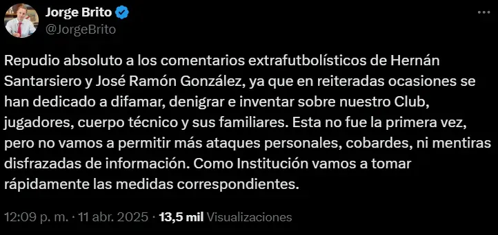 “Repudio absoluto a los comentarios extrafutbolísticos de Hernán Santarsiero y José Ramón González, ya que en reiteradas ocasiones se han dedicado a difamar, denigrar e inventar sobre nuestro Club, jugadores, cuerpo técnico y sus familiares. Esta no fue la primera vez, pero no vamos a permitir más ataques personales, cobardes, ni mentiras disfrazadas de información. Como Institución vamos a tomar rápidamente las medidas correspondientes”, escribió Jorge Brito en su cuenta de X.