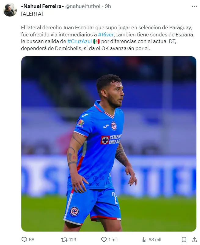 Mientras el foco está puesto en la contratación de un 9 de jerarquía, a River le cayó del cielo la chance de contratar un lateral derecho. El defensor paraguayo Juan Escobar, que lleva más de 4 años en Cruz Azul, fue ofrecido al Millonario en las últimas horas.