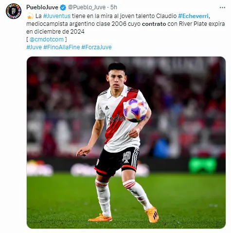 El rendimiento del campeón del mundo en 2018 no es el mismo desde su retorno a la Vecchia Signora y, según informó el sitio especializado calciomercato.com, desde Turín se habrían puesto en contacto con River con la intención de negociar por Claudio Echeverri por decisión de Cristiano Giuntoli, director deportivo del club italiano.