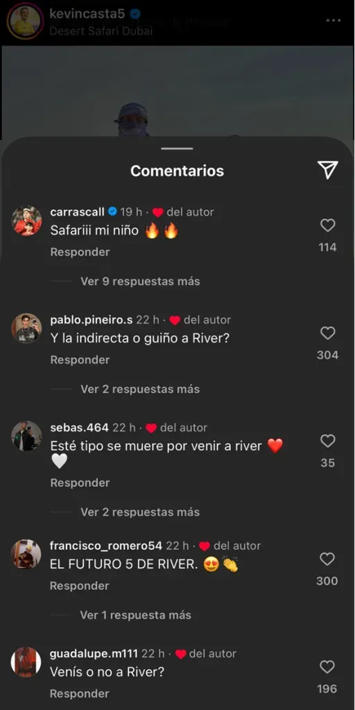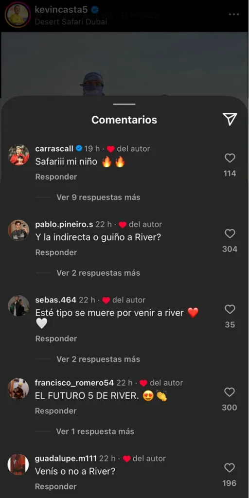 “Este tipo se muere por venir”, “el futuro 5 de River” y “¿venís o no?” fueron algunos de los mensajes de la gente. El jugador se encargó de darle me gusta a esas respuestas de los aficionados, exteriorizando sus deseos de unirse a las filas de Marcelo Gallardo dentro de poco.