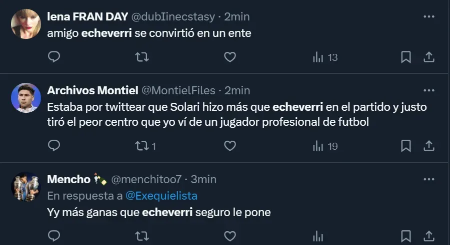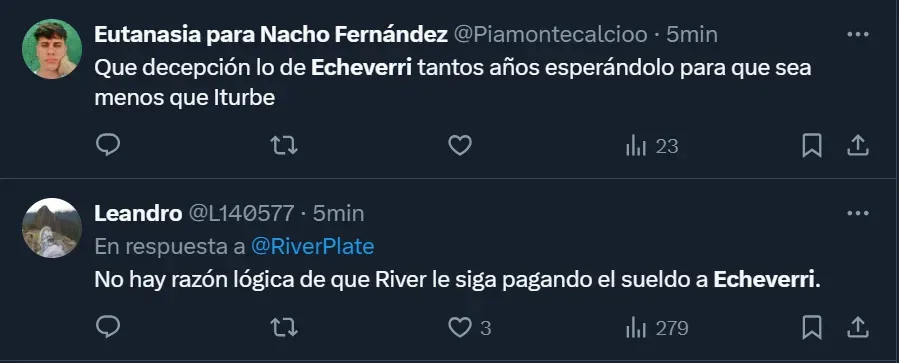 A pesar de que no iba a ser titular, a último momento Gallardo decidió mandarlo en lugar de Facundo Colidio, que terminó ingresando en el complemento. Sin embargo, no gravitó ni fue determinante para que el Millo pudiera modificar el resultado: “Que decepción lo de Echeverri tantos años esperándolo para que sea menos que Iturbe”, fue la queja del usuario de X, @Piamontecalcioo, que se mostró muy enojado con el Diablito.