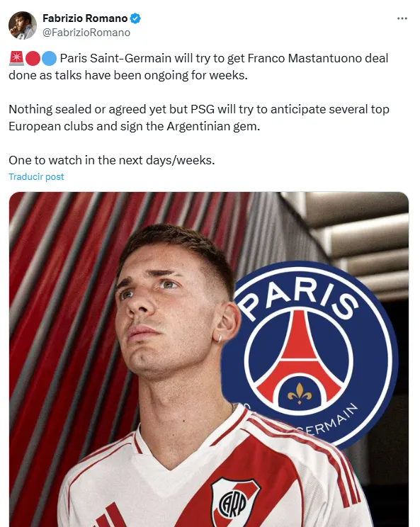 ”El Paris Saint-Germain intentará cerrar el fichaje de Franco Mastantuono, ya que las conversaciones se llevan a cabo desde hace semanas. Aún no hay nada cerrado ni acordado, pero el PSG intentará anticiparse a varios grandes clubes europeos y fichar a la joya argentina. Uno que tendremos que seguir en los próximos días/semanas”, publicó Romano.