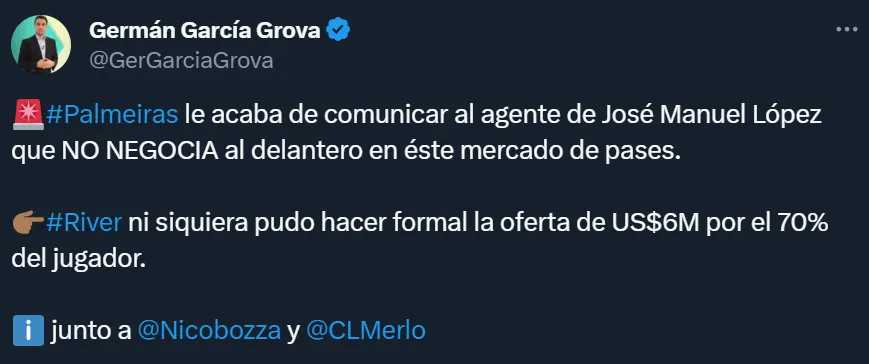 Según indicaron los periodistas Nicolás Bozza, Germán García Grova y César Luis Merlo, el Flaco López continuará luciendo la camiseta de Palmeiras, porque no lo negociarán durante este mercado de pases. Pero la información no quedó allí.