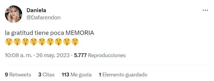 Con un mensaje en su cuenta de Twitter (que también se encargó de compartir en Instagram), la mujer fue contundente: “La gratitud tiene poca MEMORIA”. Además, al mensaje le sumó muchos emojis pidiendo silencio, mismo gesto que el arquero hizo cuando lo cuestionaban en la Selección Argentina y tapó un penal clave ante Paraguay.