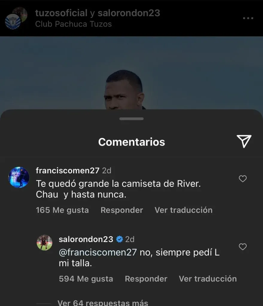 “Te quedó grande la camiseta de River. Chau y hasta nunca“, disparó el usuario @franciscomen27. Rápidamente, Rondón respondió el mensaje con un “No, siempre pedí L. Mi talla“.