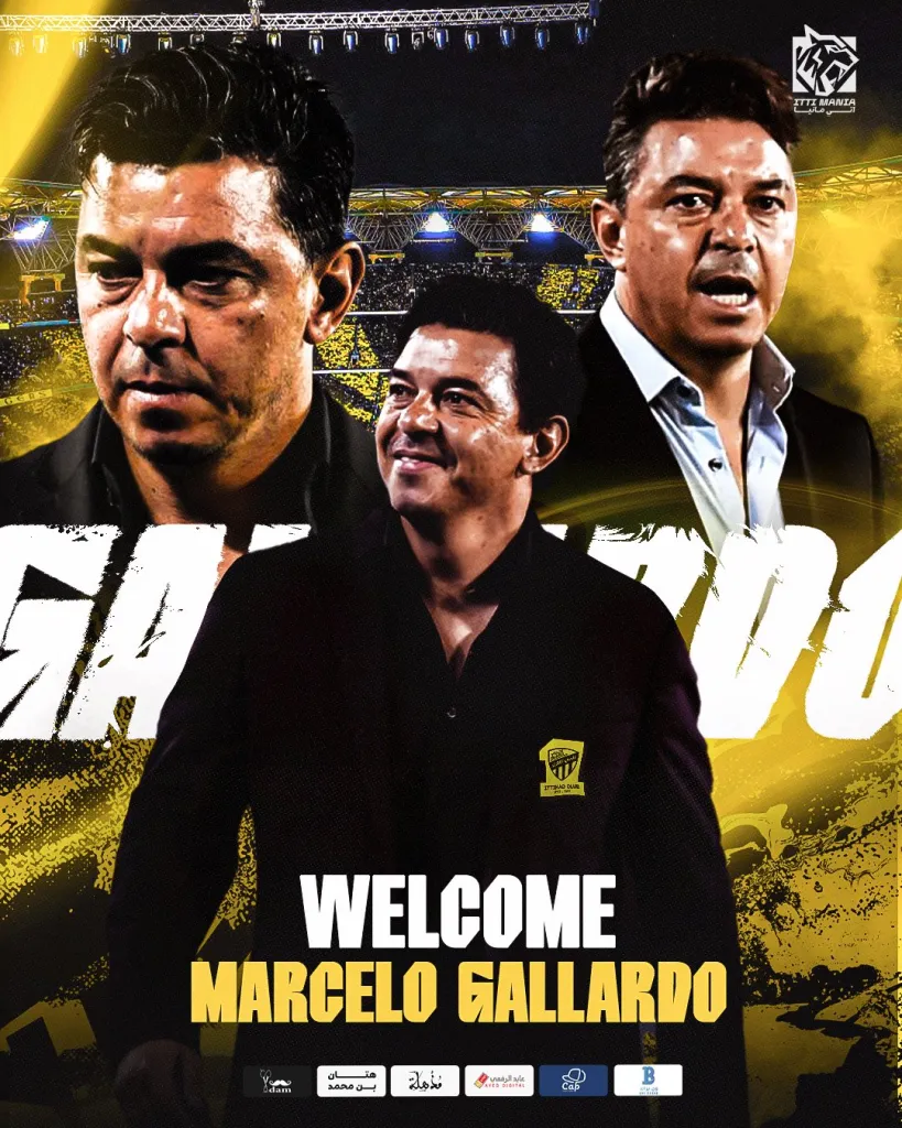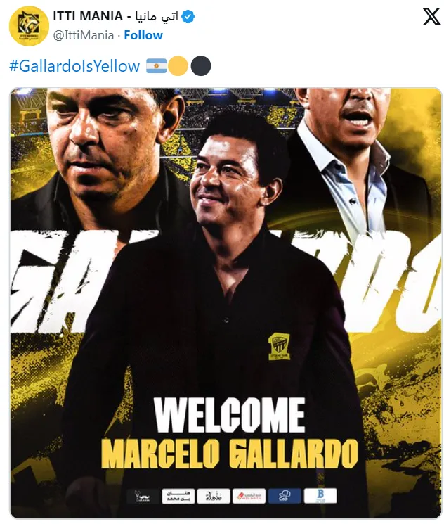 #GallardoIsYellow escribió el medio Itti Manía, que cuenta con más de medio millón de seguidores en Twitter. El club compartió una imagen que dice “welcome, Marcelo Gallardo”, junto con tres fotos del DT en River, pero con el escudo del Al Ittihad tapando el de River en su típico saco.
