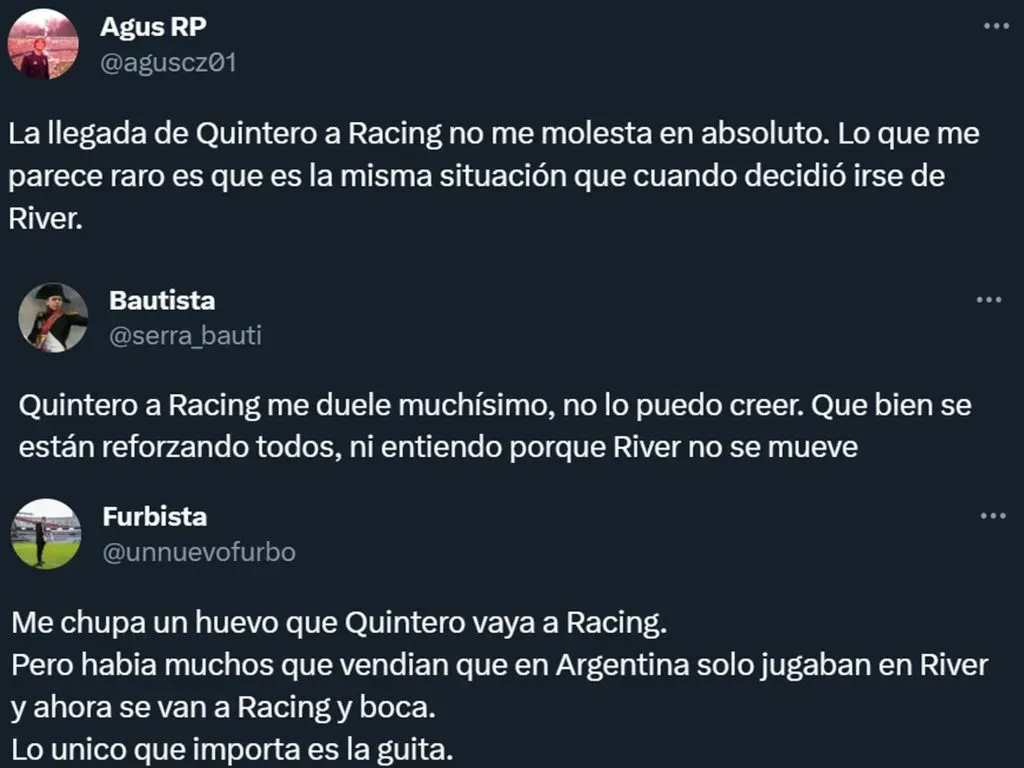 “Me duele muchísimo, no lo puedo creer” y “Había muchos que vendían que en Argentina solo jugaban en River, y ahora se van a Racing y Boca. Lo único que importa es la guita”, fueron algunos de los comentarios que se visualizaron en las redes sociales. Pero también hubo hinchas que recordaron que el Banco Central de la Nación no le permitió al Millonario poder hacer la compra del pase de Juanfer, y que ante la misma situación se lo permitieron a la Academia.