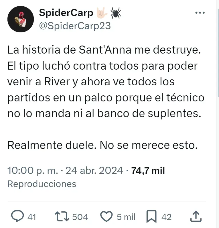“Me destruye”, “¿qué hizo para merecer esto?”, “que triste”, fueron algunas de las reacciones de la gente de River luego de ver lo que posteó el marcador de punta. Lo cierto es que pasan los partidos y este refuerzo sigue sin tener continuidad. ¿Cuándo volverá a tener una chance?