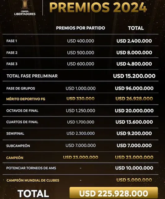 Desde la casa madre del fútbol sudamericano informaron que, en 2024, solamente por jugar la fase de grupos, cada equipo recibirá un millón de dólares. Además, por partido ganado y para evitar suspicacias -sobre todo en las fechas finales- en esa instancia habrá un premio de 330 mil dólares.