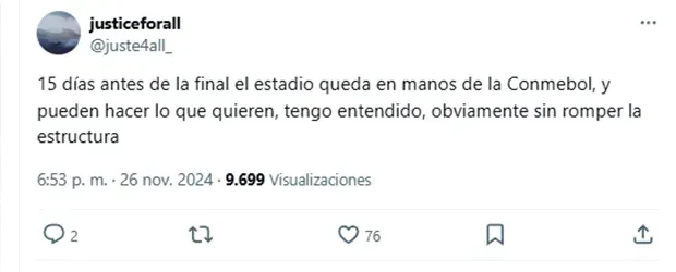 Sin embargo, también hubo quienes reconocieron que lo que sucedió estaba previamente estipulado y hubiese sucedido incluso si River accedía a jugar en su estadio la final de la Copa Libertadores. “El estadio queda en manos de CONMEBOL y pueden hacer lo que quieran, tengo entendido, sin romper la estructura”, advirtió uno de ellos. “Hay millones de cosas para pegar, pero esto no. Aunque nos duela“, señaló otro.