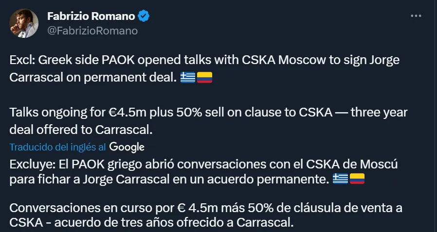 En las últimas horas, el periodista Fabrizio Romano confirmó que el futuro de Jorge Carrascal estaría en la liga griega, dado a que PAOK quiere llevárselo e inició la negociación con CSKA Moscú para adquirir el 100% del pase. Y esto beneficiará a River, quien posee un 10% de la ficha del colombiano por el que ya ingresaron cerca de 4 millones de euros tras ser vendido a Rusia.