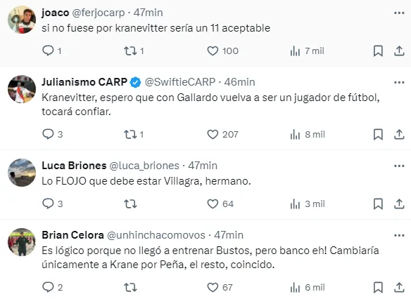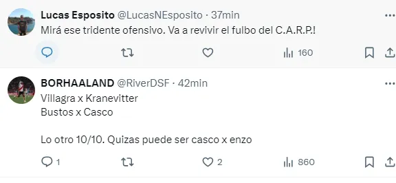 Por otro lado, también mostraron inconformismo con el doble cinco, ya que un grupo de fanáticos de River no están de acuerdo con que la mitad de cancha sea compartida por Rodrigo Aliendro y Matías Kranevitter, por lo que pidieron por la inclusión de Felipe Peña Biafore o Rodrigo Villagra.