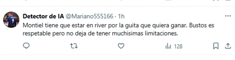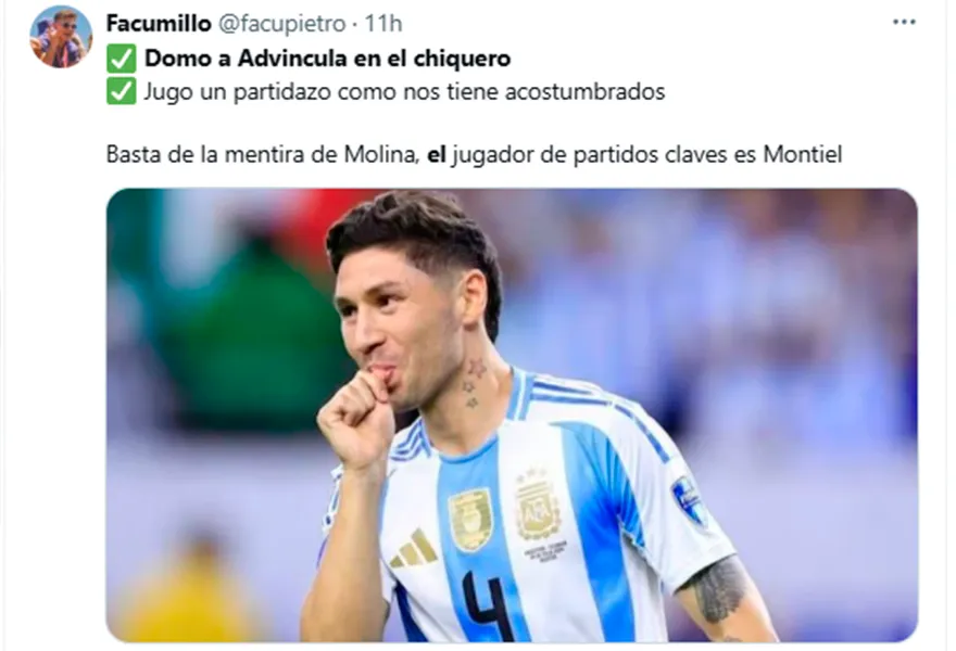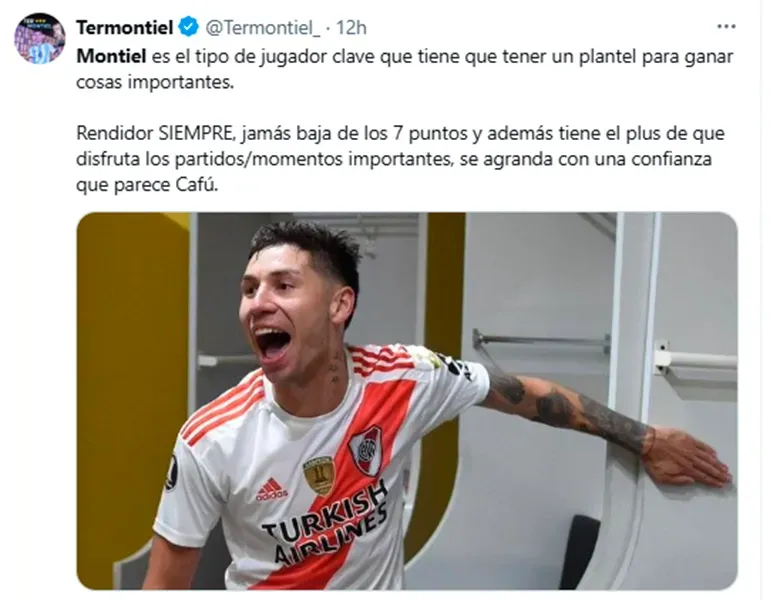 “Abrazame hasta que vuelva Gonzalo Montiel”, escribió uno. “Montiel tiene que estar en River por la guita que quiera ganar”, señaló otro. “Dale, activá”, expresó un tercero arrobando al presidente Jorge Brito. “Montiel es el tipo de jugador clave que tiene que tener un plantel para ganar cosas importantes”, apuntó uno más.