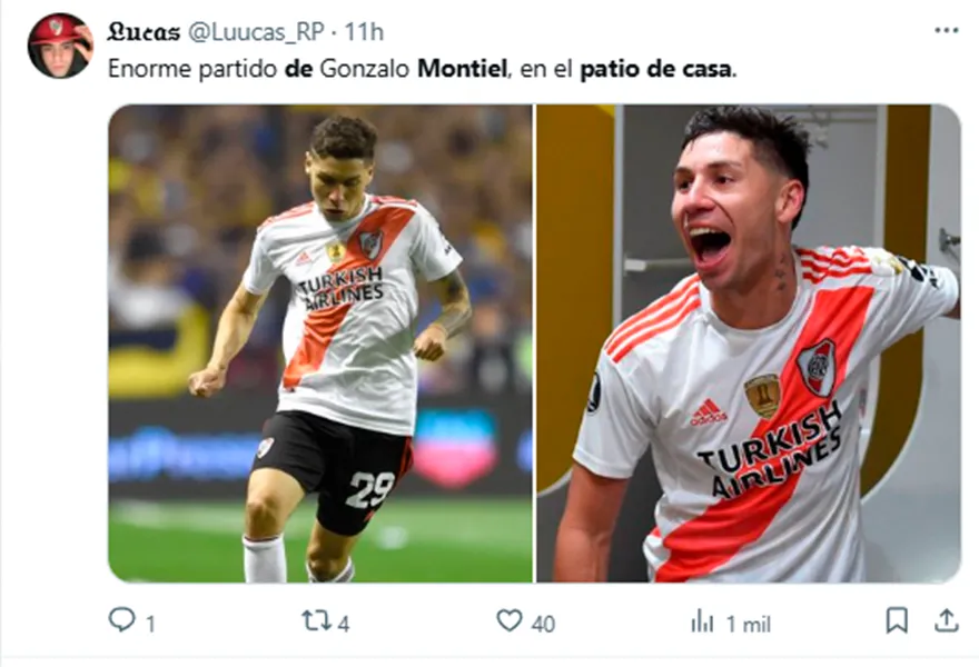 “Enorme partido de Gonzalo Montiel, en el patio de casa”, escribió uno de ellos. “Domó a Advíncula en el chiquero. Jugó como nos tiene acostumbrados”, sentenció otro. “Literalmente, Montiel y Palacios cuando La 12 se puso a cantar ‘decime qué se siente…'”, comentó un tercero compartiendo un video en que se ve a los dos exjugadores de River riendo a carcajadas. “Qué lindo sería que haga un gol y festeje mirando a La 12”, apuntó uno más.
