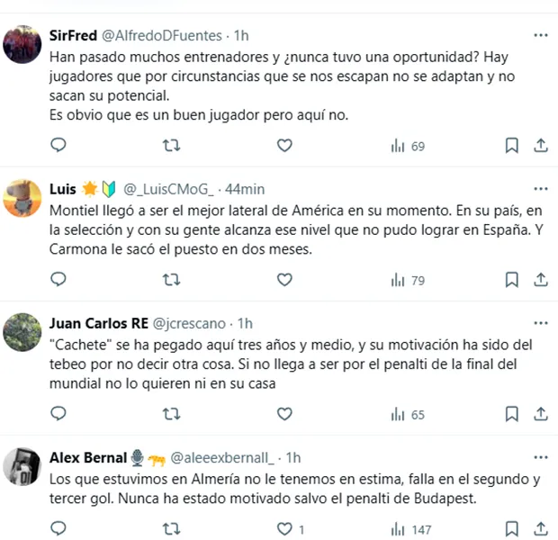 “Han pasado muchos entrenadores y ¿nunca tuvo una oportunidad? Hay jugadores que por circunstancias que se nos escapan no se adaptan y no sacan su potencial. Es obvio que es un buen jugador, pero aquí no“, escribió en X uno de ellos. “Cachete se ha pegado aquí tres años y medio, y su motivación ha sido del tebeo por no decir otra cosa. Si no llega a ser por el penalti de la final del Mundial no lo quieren ni en su casa“, arremetió otro.