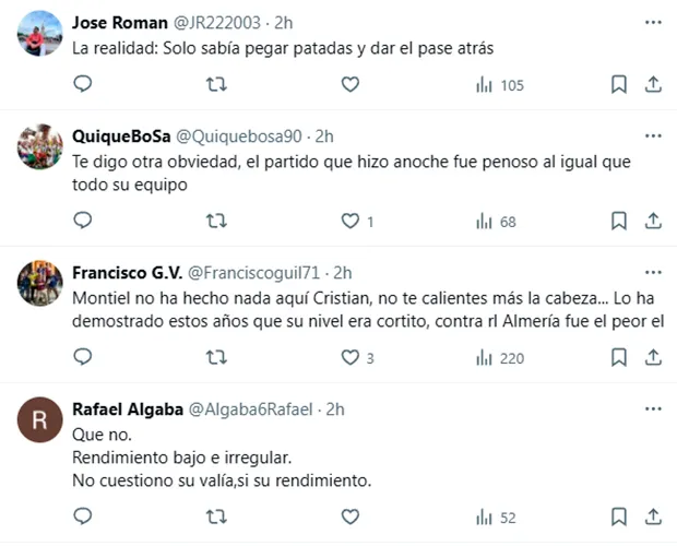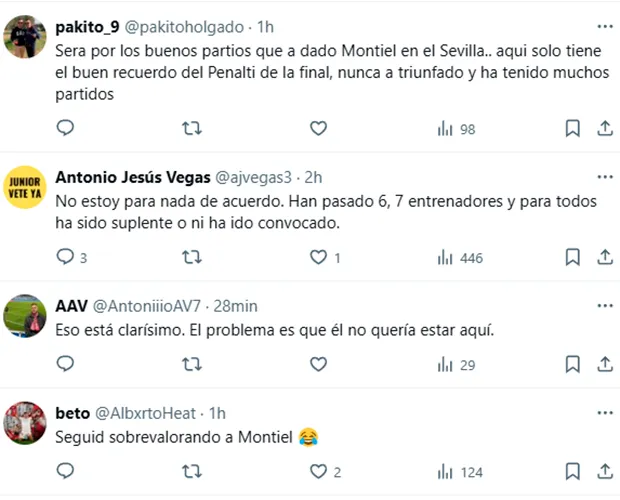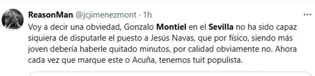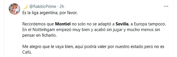 “Voy a decir una obviedad, Gonzalo Montiel en el Sevilla no ha sido capaz siquiera de disputarle el puesto a Jesús Navas, que por físico, siendo más joven, debería haberle quitado minutos. Por calidad obviamente no. Ahora cada vez que marque este o Acuña, tendremos tuit populista”, reflexionó un tercero. “Es la liga argentina, por favor. Recordemos que Montiel no solo no se adaptó a Sevilla, a Europa tampoco. En el Nottinhgam empezó muy bien y acabó sin jugar y mucho menos sin pensar en ficharlo. Me alegro que le vaya bien, aquí podría valer por nuestro estado pero no es Cafú“, señaló uno más, menospreciando además la Liga Profesional.