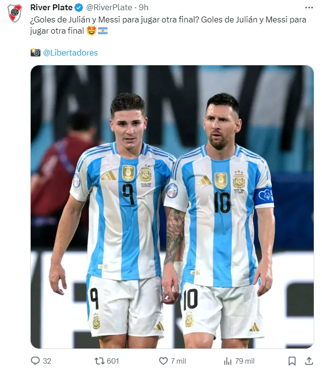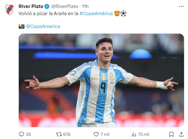 “Volvió a picar la Araña en la Copa América“, fue la primera reacción de River, que generó miles de interacciones. Un rato más tarde, junto a una imagen del 9 con Leo, escribió: “¿Goles de Julián y Messi para jugar otra final? Goles de Julián y Messi para jugar otra final”. Una clara referencia a la anterior semifinal que disputó Argentina ante Croacia, que también tuvo a estos dos protagonistas en el marcador.