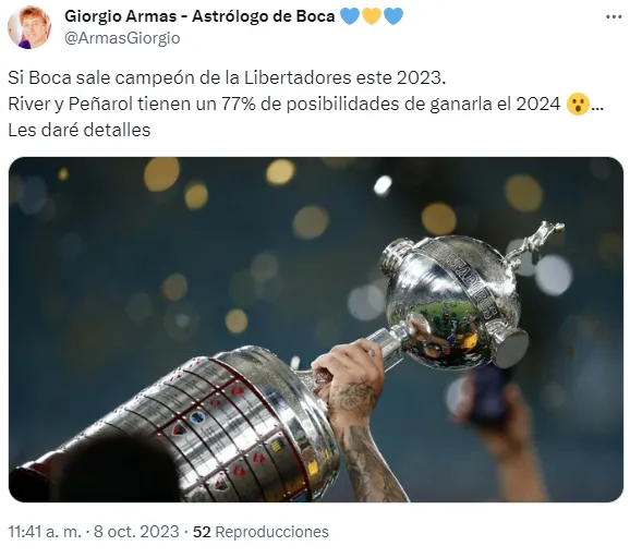 Referido a esto, el reconocido astrólogo hincha de Boca, Giorgio Armas, quien predijo que el Xeneize ganará esta Copa Libertadores, publicó una sorpresiva predicción en su cuenta de Twitter, en la que habla sobre la participación del Millonario en la edición del 2024.