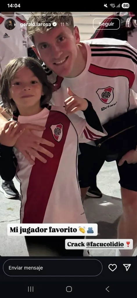 Una vez terminado el partido, Benjamín se sacó fotos con algunos de los jugadores de River y su madre lo compartió en sus historias de Instagram. Primero compartió una imagen junto a Juanfer Quintero y luego abrazado a Facundo Colidio, a quien denominó como su favorito.