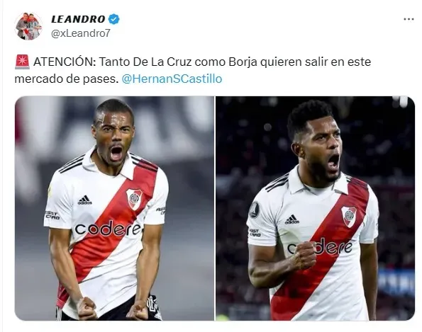 Tal como lo adelantó el periodista Hernán Castillo, Nicolás De La Cruz y Miguel Borja esperan ser transferidos en este mismo mercado de pases antes de la fecha límite, pactada para el 31/08. El uruguayo había recibido una promesa de venta y, la eliminación de River de la Copa podría acelerar el proceso. El colombiano, en tanto, no estaría conforme con la cantidad de minutos que goza de la mano de Demichelis.