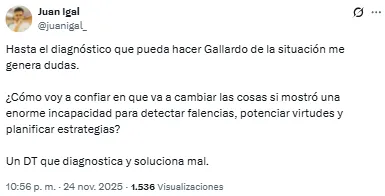 - “Es un año malo dentro de mi carrera como entrenador, pero tuve también otros buenos. Todo lo que pueda explicar acá tampoco tiene mucha defensa con relación a mi persona y no tiene mucho sentido. Me conozco, sé quién soy y cómo trabajo junto a mi equipo y con eso estoy bien conmigo”.