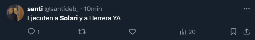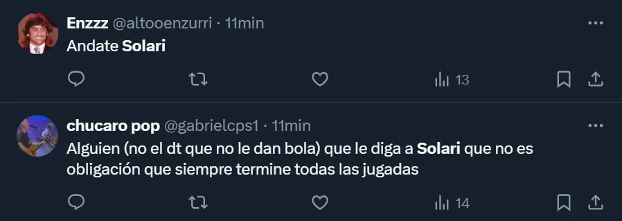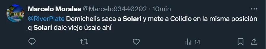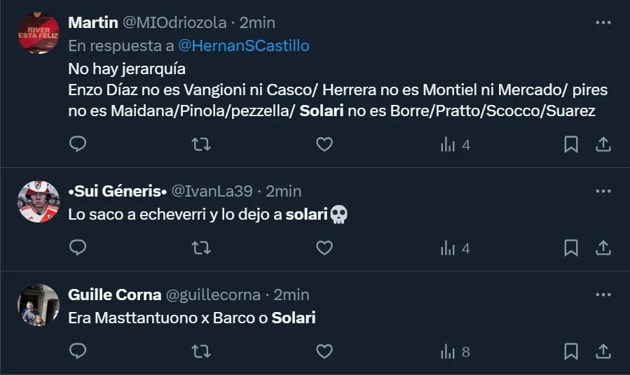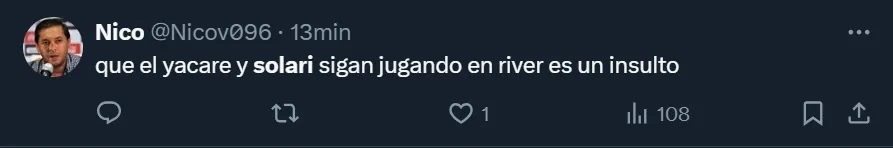 Por medio de X, la ex Twitter, hubo comentarios de todo tipo. Algunos muy hirientes, y otros simplemente cuestionando la presencia de los futbolistas en el plantel profesional del Millonario. Así se pudo leer frases como “que el Yacaré y Solari sigan jugando en River es un insulto”, “andate Solari”, “alguien (no el DT que no le dan bola) que le diga a Solari que no es obligación que siempre termine todas las jugadas” o “Demichelis sacá a Solari y meté a Colidio en la misma posición que Solari, dale viejo usalo ahí”.
