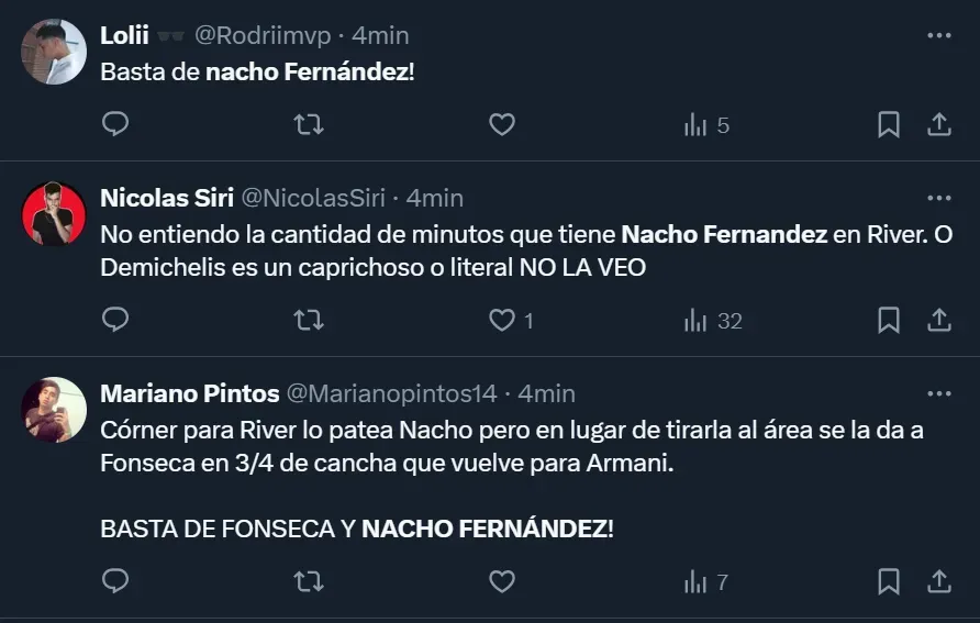 Por lo que fue su performance durante todo el tiempo que estuvo presente en el juego, más de un hincha criticó a Fernández e incluso pidió por su salida, tanto del partido como de la institución, ya que sienten que es titular debido al peso de su apellido y la historia que posee en River.