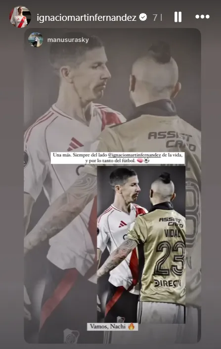 Nacho replicó en una historia de Instagram una foto que lo muestra cara a cara con Vidal durante la revancha que se disputó en el Monumental. “Una más. Siempre del lado Ignacio Fernández de la vida. Y por lo tanto del fútbol”, acompaña como mensaje.