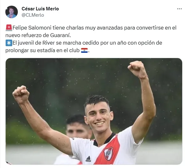 La potencial segunda salida desde Núñez la anunció el periodista César Luis Merlo a través de su cuenta de Twitter. “Felipe Salomoni tiene charlas muy avanzadas para convertirse en el nuevo refuerzo de Guaraní. El juvenil de River se marcha cedido por un año con opción de prolongar su estadía en el club”, informó el de TyC Sports en redes sociales. Un salida con el objetivo de sumar minutos para volver con más posibilidades de jugar en Primera.
