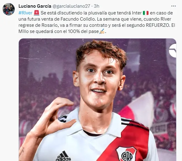 Además, agrega que la semana que viene, cuando River regrese de Rosario, va a firmar su contrato y será presentado como el segundo refuerzo del equipo dirigido por Martín Demichelis, para luego sumarse a los entrenamientos junto a sus nuevos compañeros.