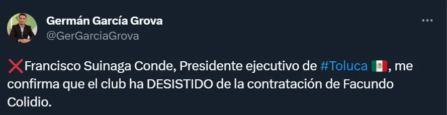 Es el caso de Facundo Colidio, quien era pretendido por Toluca. Y fue el periodista Germán García Grova quien se comunicó con Francisco Suinaga Conde, el presidente ejecutivo del club mexicano, quien le comunicó que desistieron de contratar al atacante de Inter de Milán.