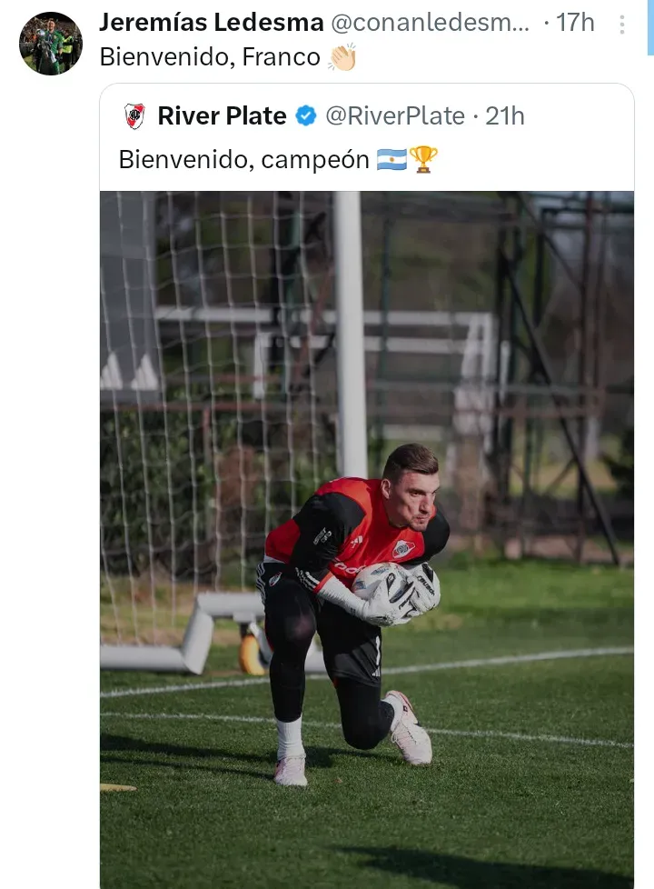 Desde su cuenta de X, Jeremías Ledesma reposteó la publicación con la que River recibió de regreso a los entrenamientos a Franco Armani y se encargó él también de saludarlo con las mejores intenciones. “Bienvenido, Franco”, le escribió a quien será su competidor.
