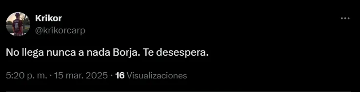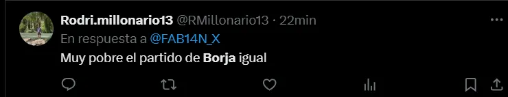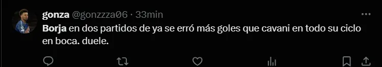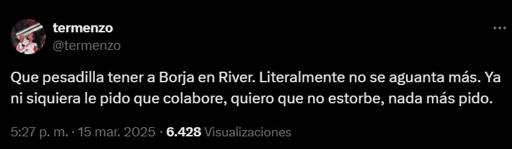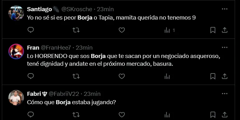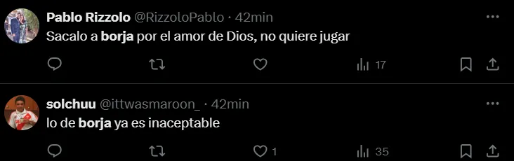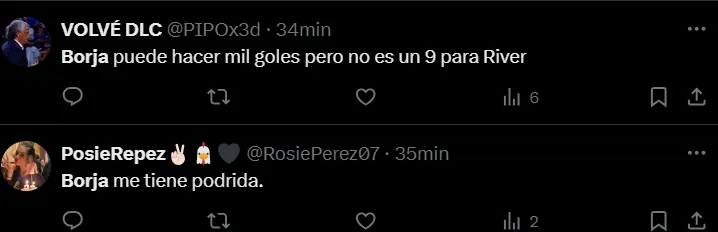“Que pesadilla tener a Borja en River”, “Literalmente no se aguanta más”, “Ya ni siquiera le pido que colabore, quiero que no estorbe, nada más pido”, “No llega nunca a nada Borja. Te desespera”, “Tristísimo lo de Borja”, “Lo de Borja ya es inaceptable”, “Borja no quiere jugar”, fueron algunos de los comentarios criticando al colombiano.