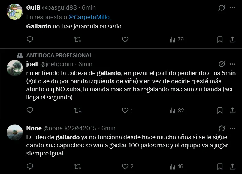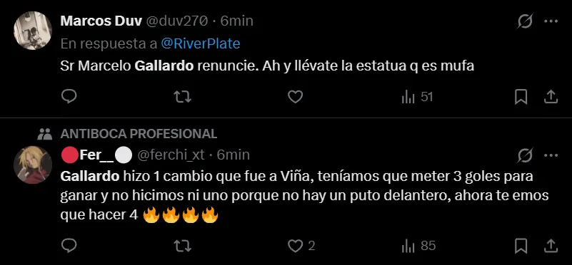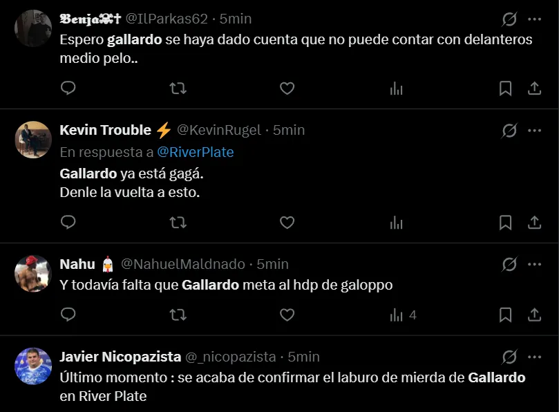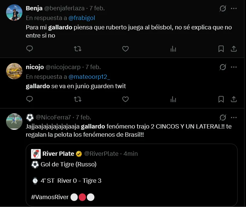 “Traigan de vuelta a Demichelis. No estoy para otro año de Gallardo”, “Gallardo se va en junio, guarden twit”, “Sr. Marcelo Gallardo, renuncie. Ah, y llevate a la estatua que es mufa”, fueron otros de los tantos comentarios que realizaron los simpatizantes de River, que mostraron todo su descontento.